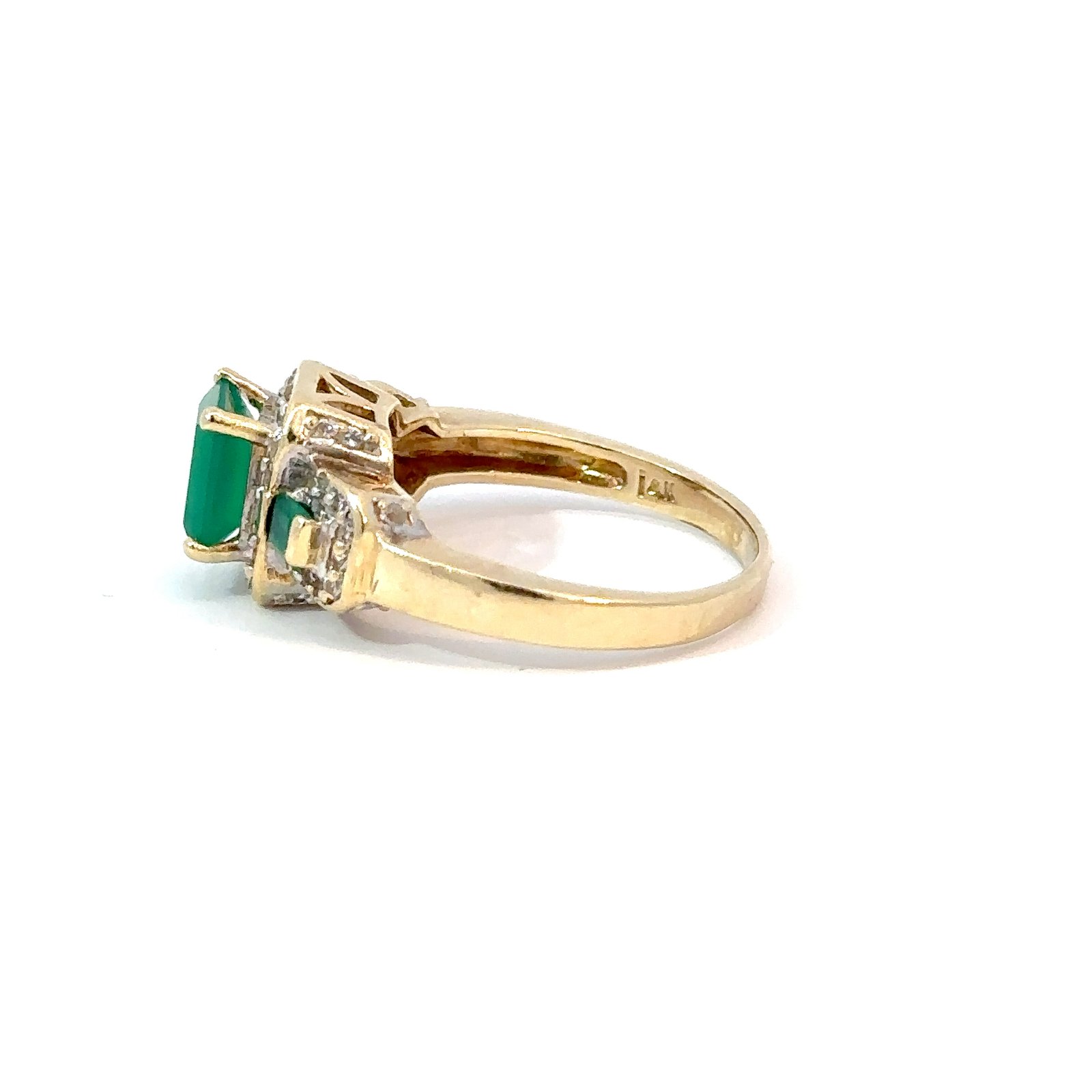 14kt Yellow Gold, Emerald, and Diamond Ring. This Beautiful Ring features a 1.25ct center emerald with 2 .10 accenting emeralds on either side. Framing the three emeralds are a border of natural colorless diamonds.