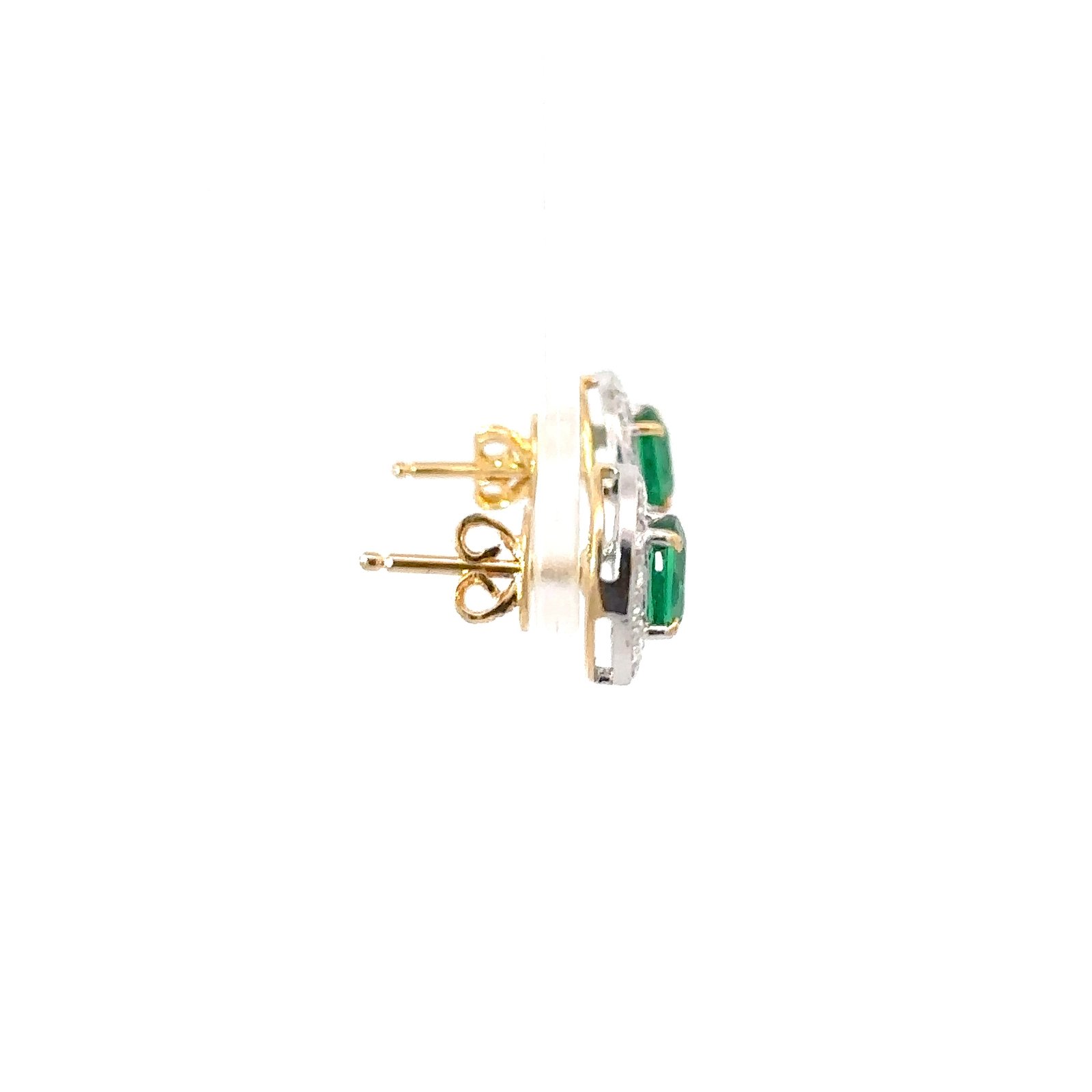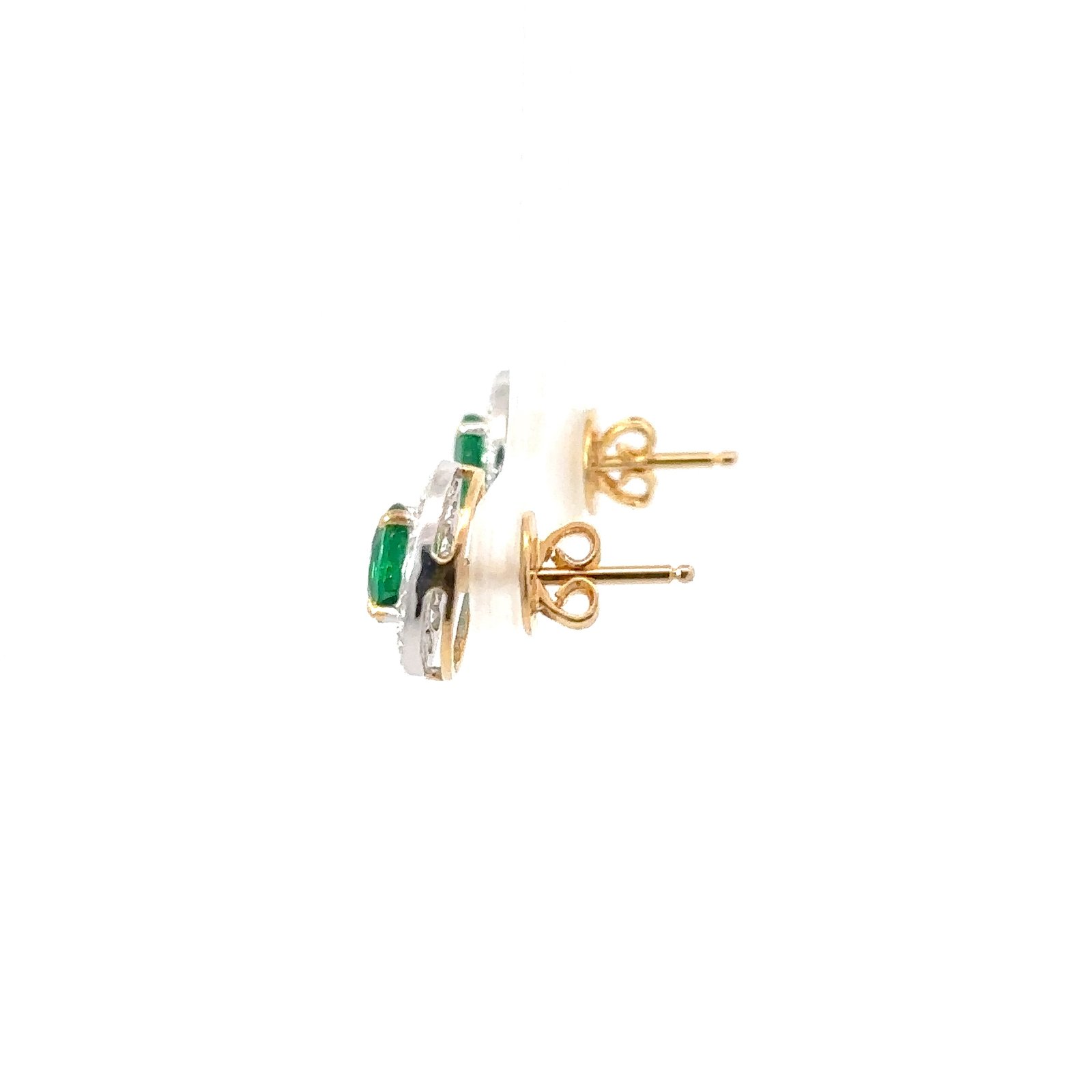A stunning pair of Synthetic Emerald earrings set into solid 18k gold. These earrings feature a standard post and back. They weigh a total of 4.4g.